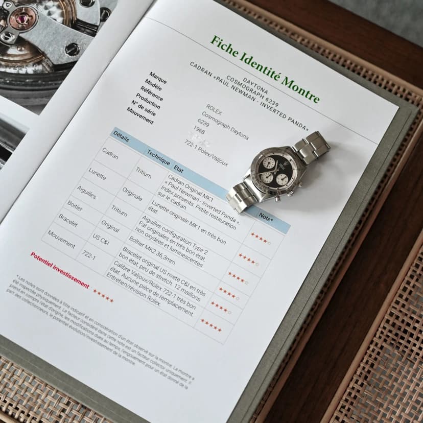 Chaque montre expertisée par Fabrice Guéroux est vendue avec une fiche d’identité présentant les caractéristiques qui lui sont propres.